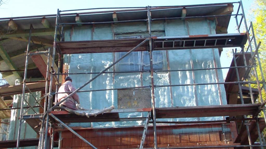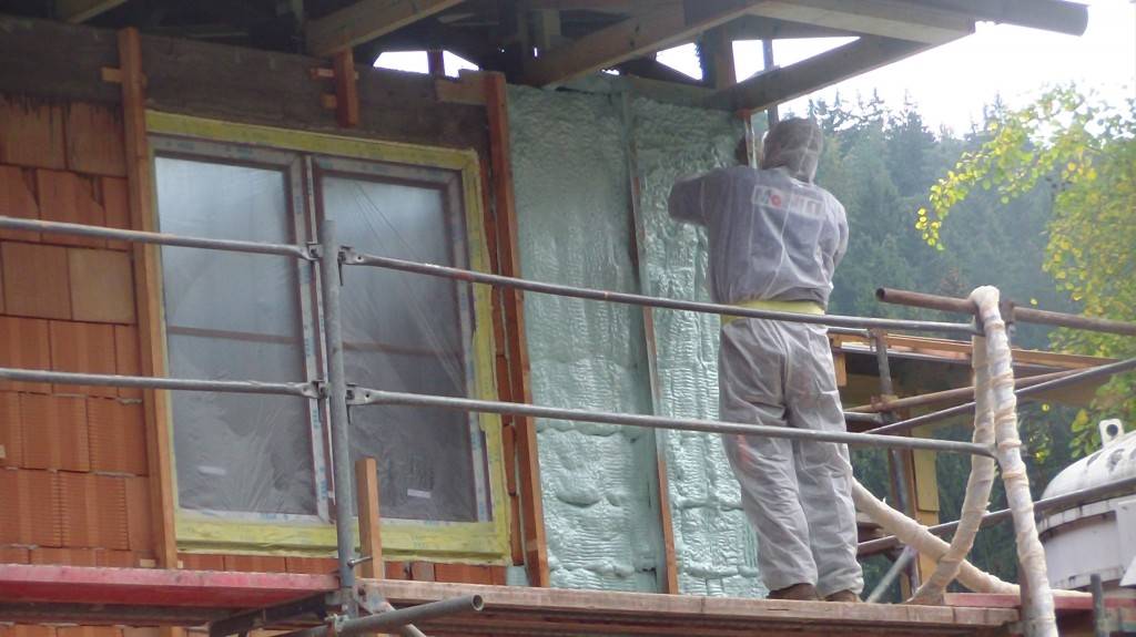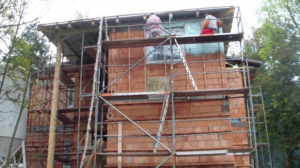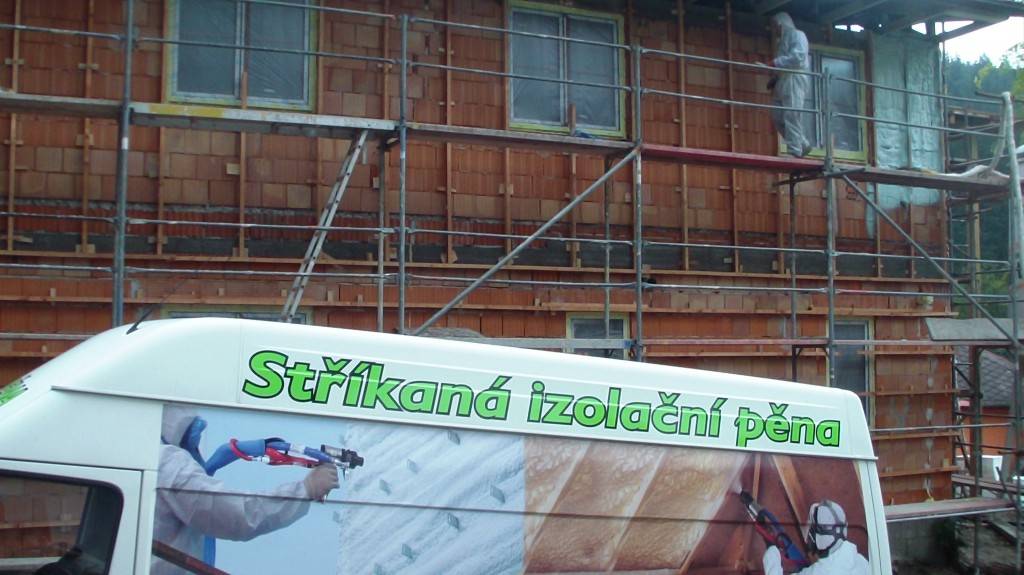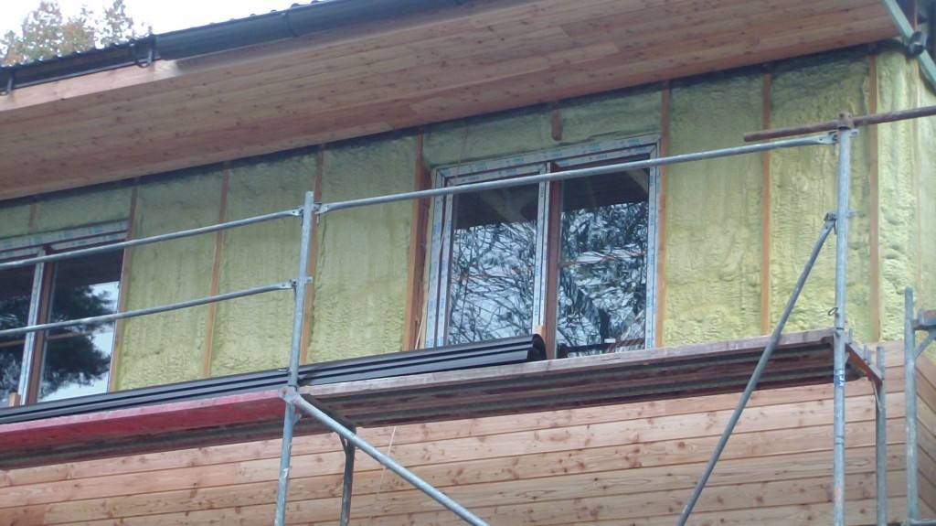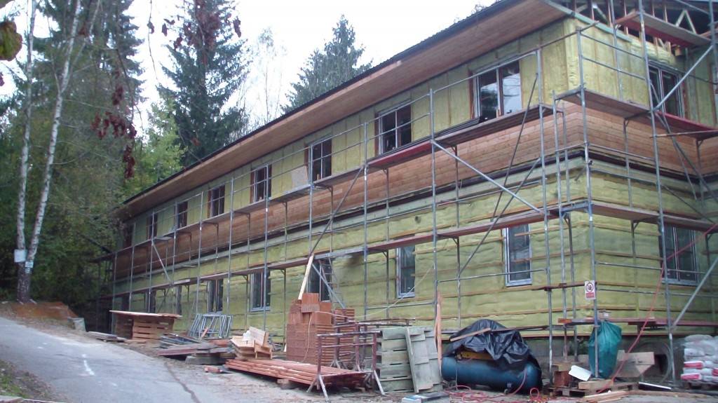 Zateplení fasády v BušínověOdvětrávaná fasáda školící středisko Bušínov – tepelná izolace izolační pěnou, záklop z modřínových desek. Fotografie