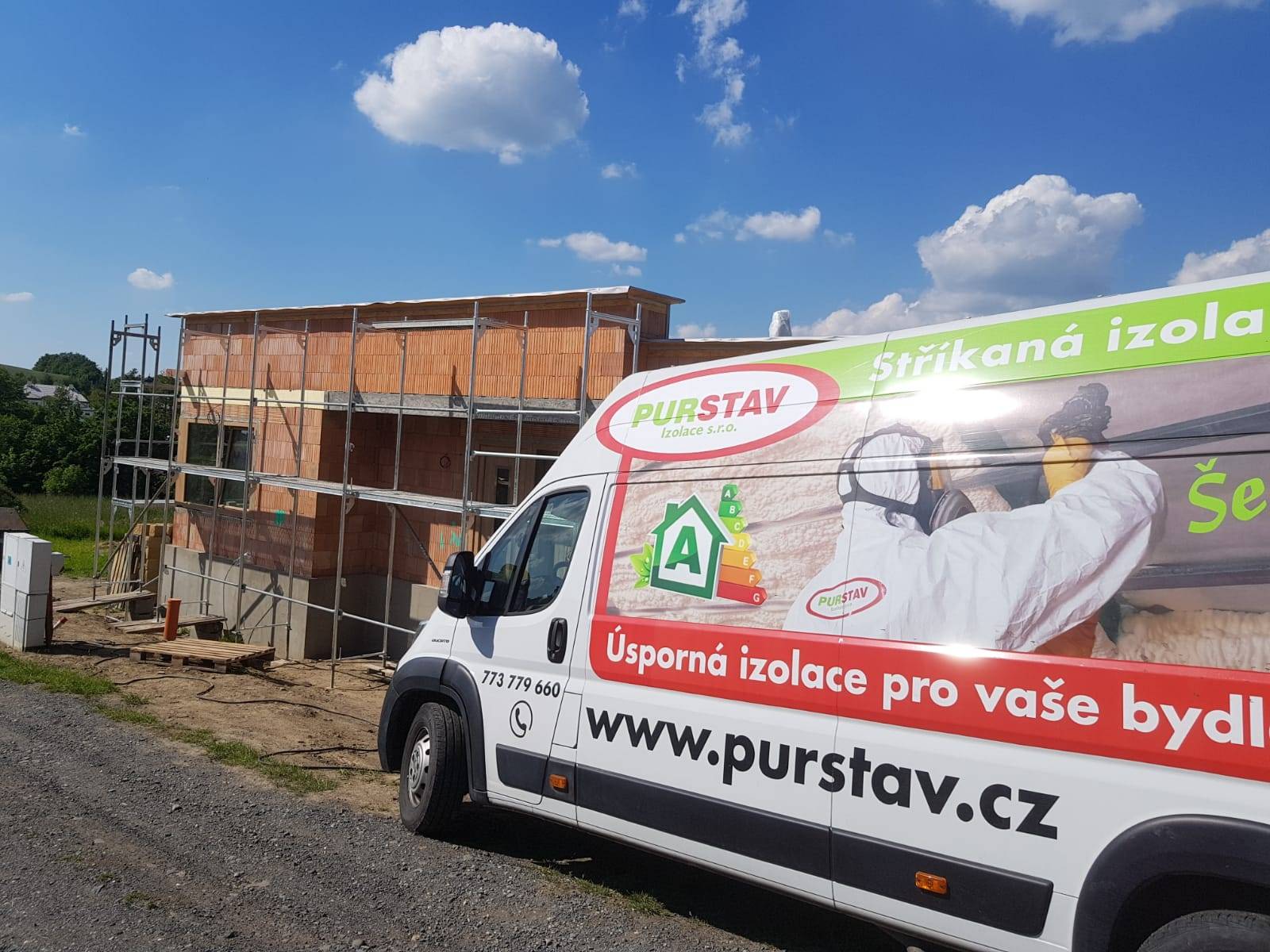 RD BílovecTepelná izolace ploché střechy na difúzní folii, měkkou pěnou EKO S310, v síle nástřiku 30 cm.